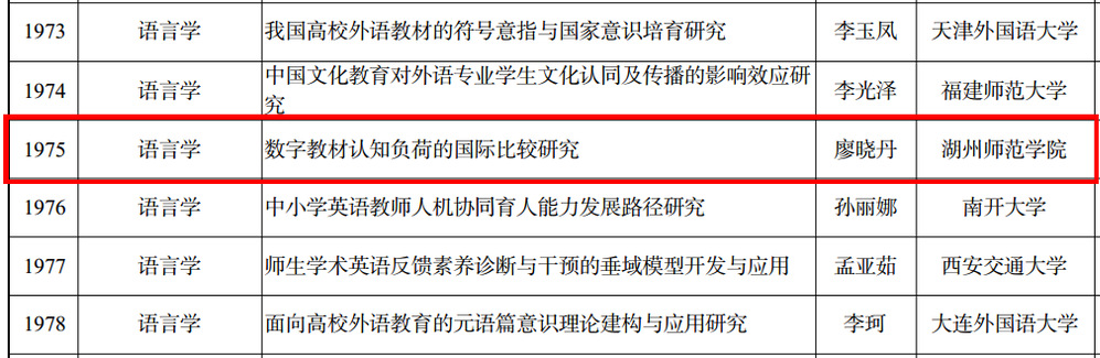 近日,2025年国家社科基金年度项目立项发布。我院廖晓丹副教授作为项目负责人申报的《数字教材认知负荷的国际比较研究》成功获批立项。这也是我院继获批国家社科基金中华学术外译项目后再次突破国家社科基金一般项目,是学院近年来不断深化人才引育和有组织科研的重要成果。
