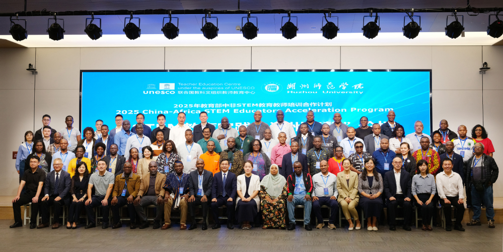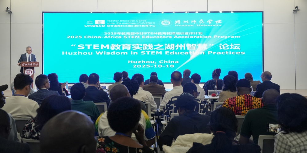 10月18日,教育部中非STEM教育教师培训合作计划“STEM教育实践之湖州智慧”论坛在我校举办。副校长楼建林、联合国教科文组织教师教育中心“中非STEM教育教师培训合作计划”负责人宋佳、湖州市教育局副局长施晓红、吴兴区教育局局长朱晨旭出席,我校教务处、国际交流与合作处、外国语学院、理学院负责人,湖州市三县两区STEM教研员、师生代表,与来自非洲11个国家近60名教育行政官员、高校学者及中小学教师代表等共百余人齐聚一堂,共话中非STEM教育。