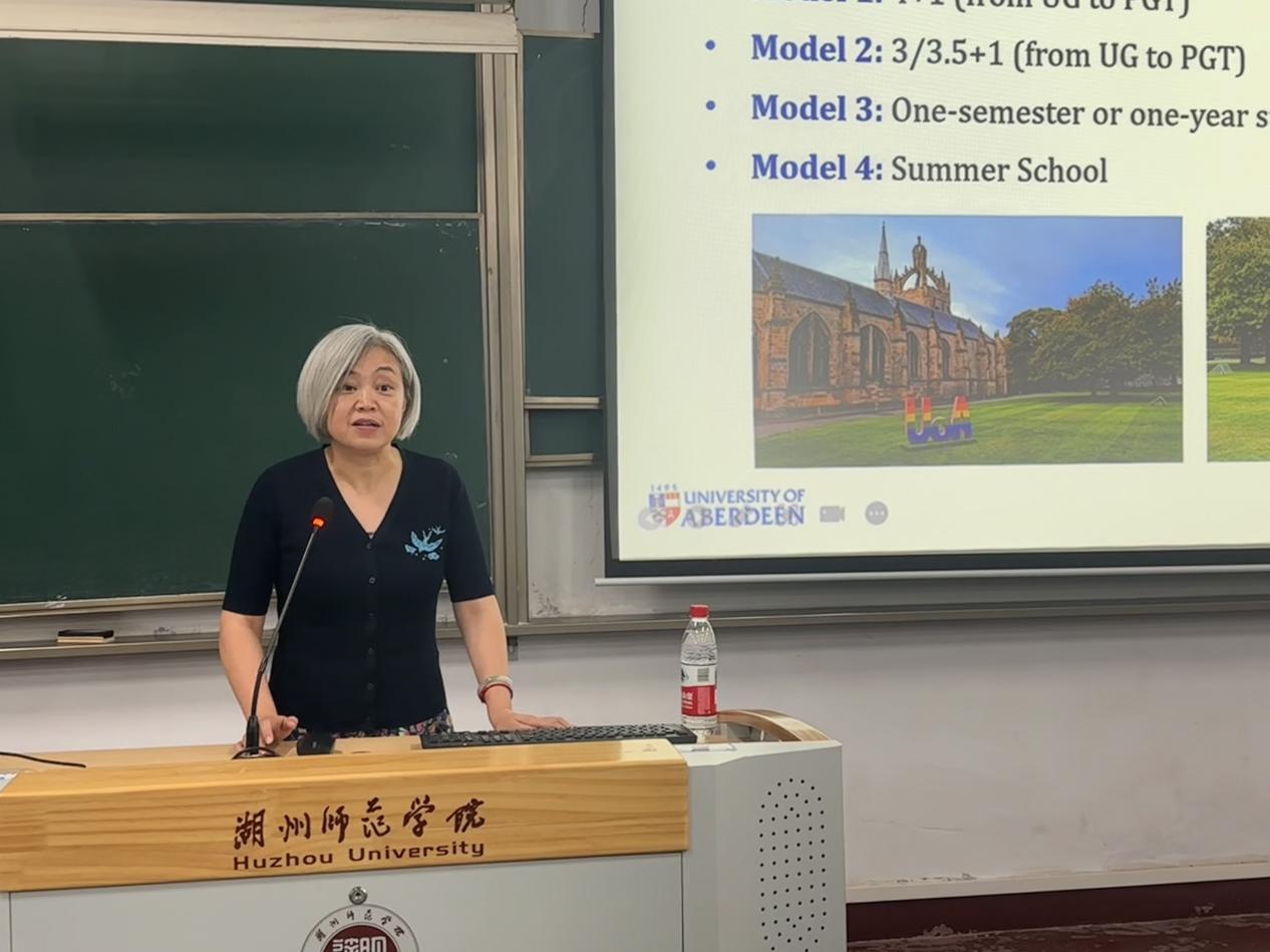 2025年11月3日晚,英国阿伯丁大学语言、文学、音乐与视觉文化学院国际合作事务主任朱珠老师应邀来院,为我院师生作阿伯丁大学硕士研究生留学项目专题宣讲。宣讲会由副院长宁强主持,2023级英语(师范)专业、2025级英语(师范)专业专升本全体学生及教师代表参加讲座。