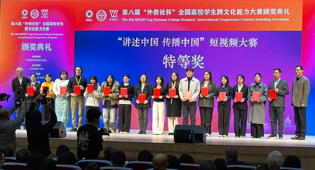 近日,第八届“外教社杯”全国高校学生跨文化能力大赛总决赛在上海落幕,我校获得全国特等奖(第一名)1项,省级特等奖1项、二等奖2项、三等奖3项,取得了我校在本赛事中的历史最佳成绩。赛事组委会综合参赛规模、作品质量与组织成效,授予我校短视频赛道“全国优秀组织奖”。