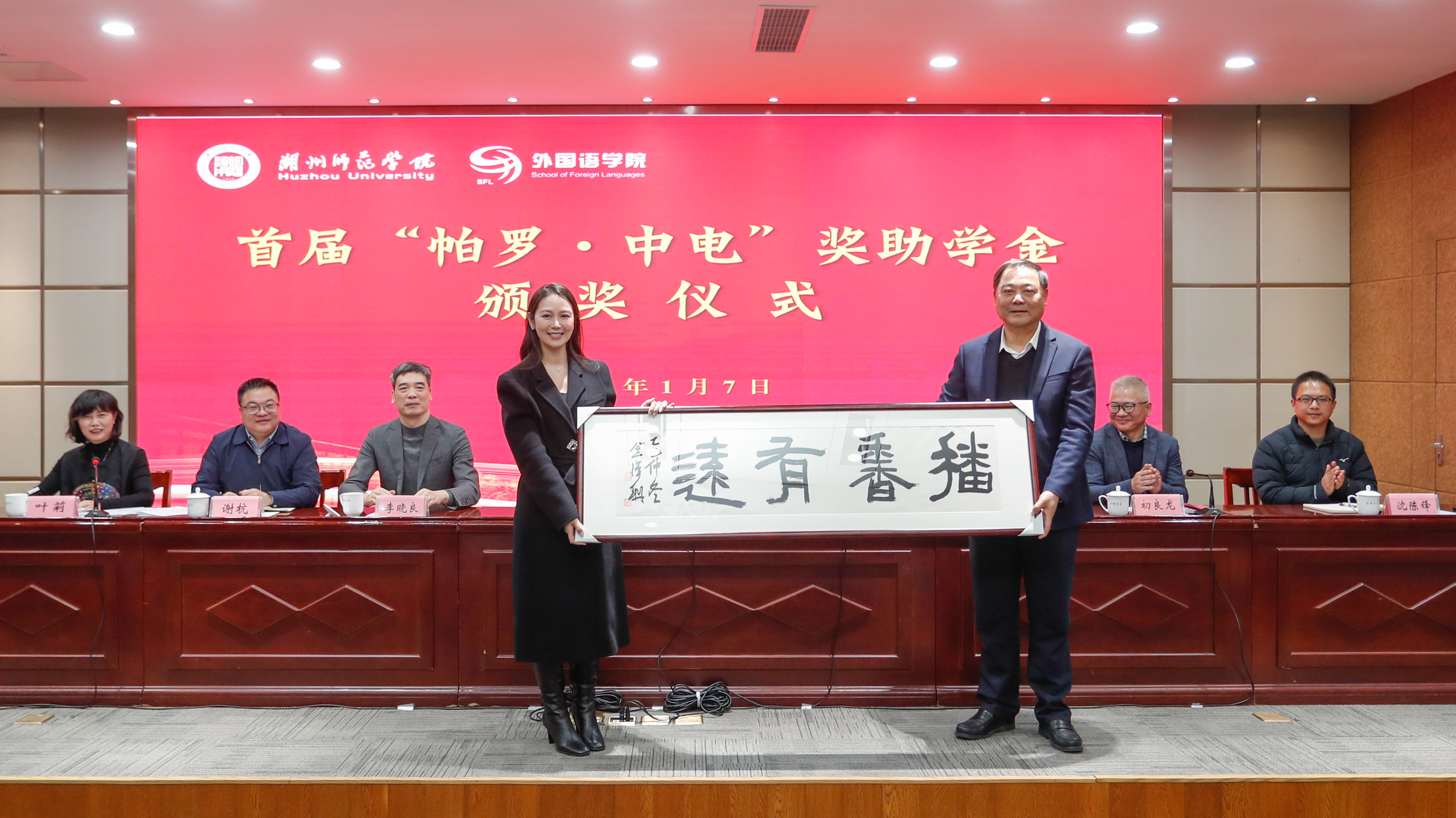 1月7日下午,首届“帕罗·中电”奖助学金颁奖仪式在我校明达楼126会议室隆重举行。校党委副书记陈永华,帕罗羊绒制品有限公司总经理、优秀校友刘乙萱,湖州市委统战部原常务副部长李晓良,湖州市政协经济委原主任、市慈善总会副会长姬海荣,校社会合作与发展联络办公室主任谢杭,外国语学院院长初良龙,院党委书记叶莉、学工部副部长沈陈锋出席,外国语学院120余名师生代表参加。本次活动由叶莉主持。