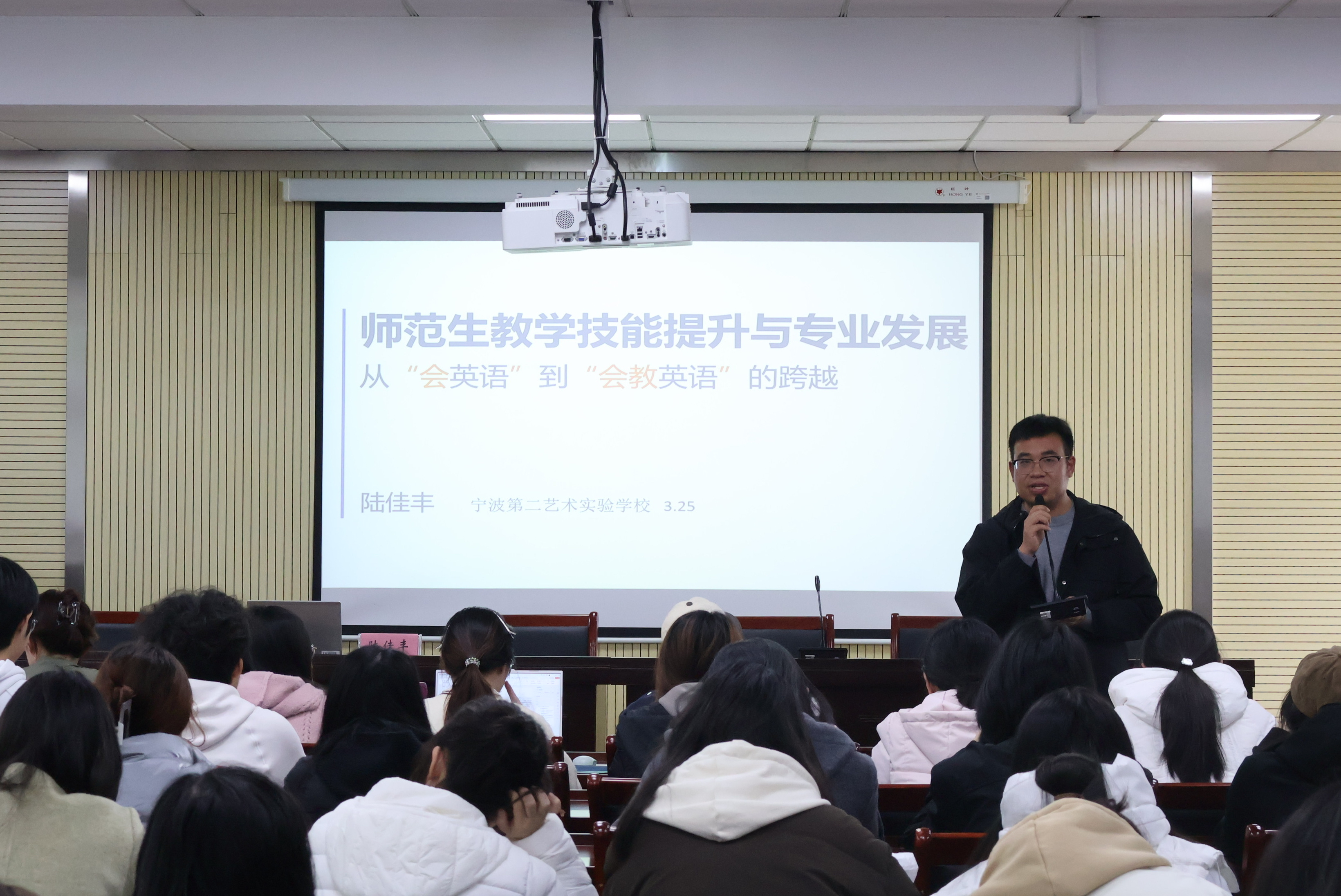 为助力英语师范生明晰职业发展路径,破解教学备考痛点,提升从教核心素养,3月25日下午,我院特邀宁波第二艺术实验学校副校长陆佳丰老师,开展以“师范生教学技能提升与专业发展”为主题的专题讲座。本次讲座聚焦“从会英语到会教英语”的核心转变,为在场师范生带来了一场兼具理论深度与实践指导意义的干货分享,助力学子们夯实教学基础,从容应对教师岗位竞争与职业挑战。