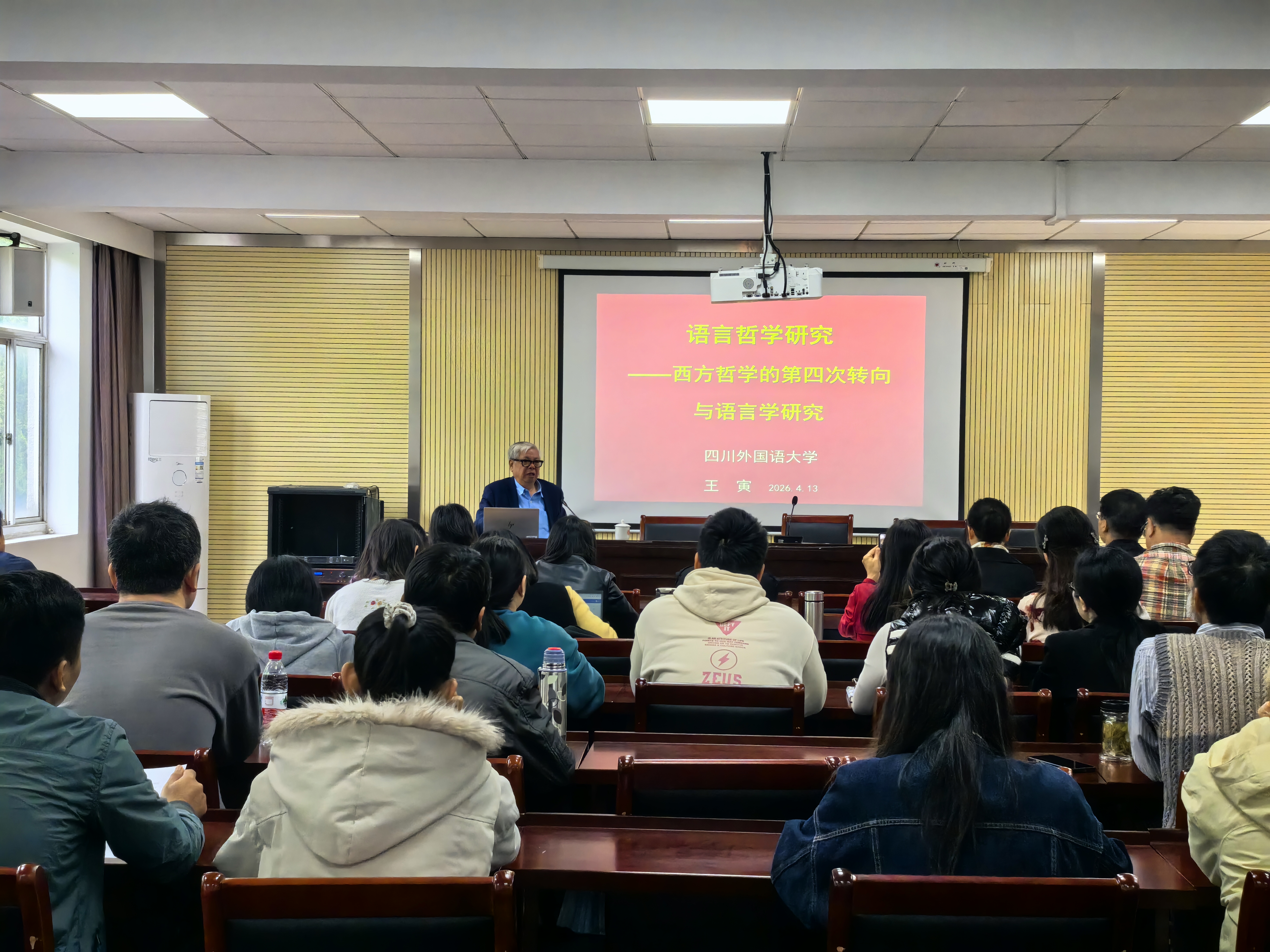 4月15日下午,四川外国语大学教授、博士生导师王寅教授应邀来院,作题为“语言哲学研究——西方哲学的第四次转向与语言学研究”的学术讲座。院长初良龙、副院长宁强、学术副院长宋武全以及学术骨干、感兴趣的师生共同聆听了讲座。讲座由宁强主持。